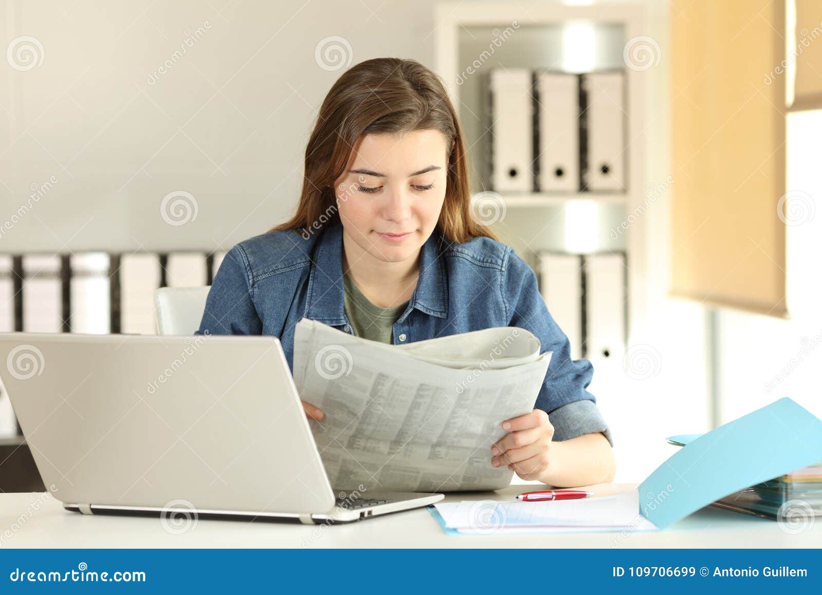 Young Trainee Reading A Newspaper At Office Stock Image ...